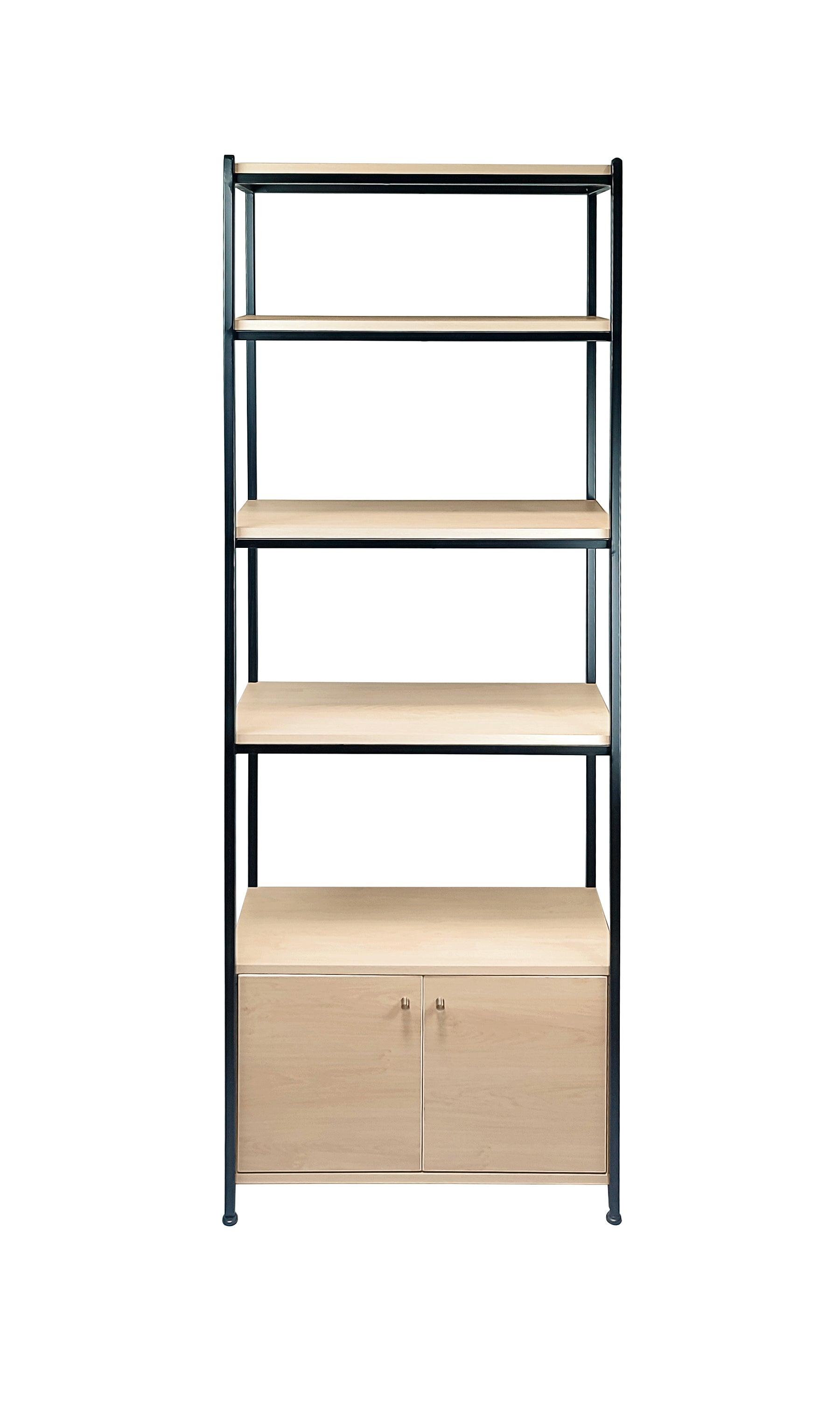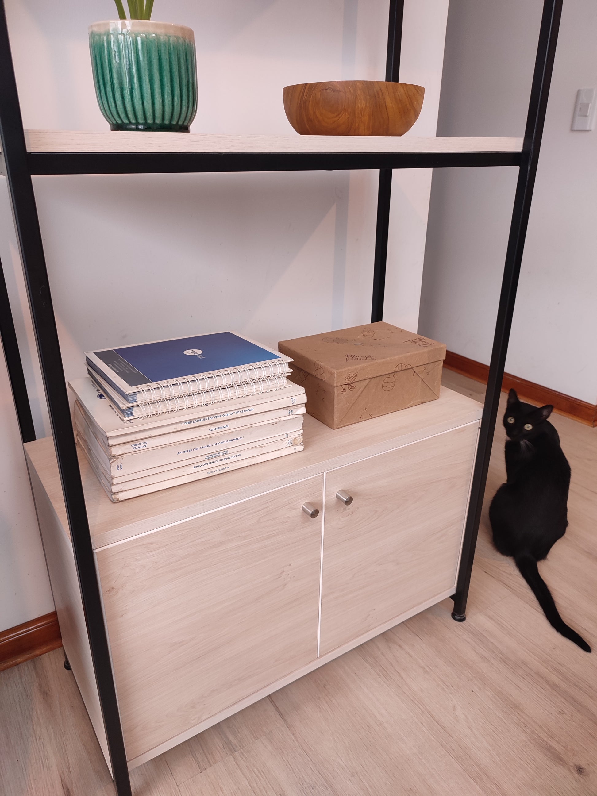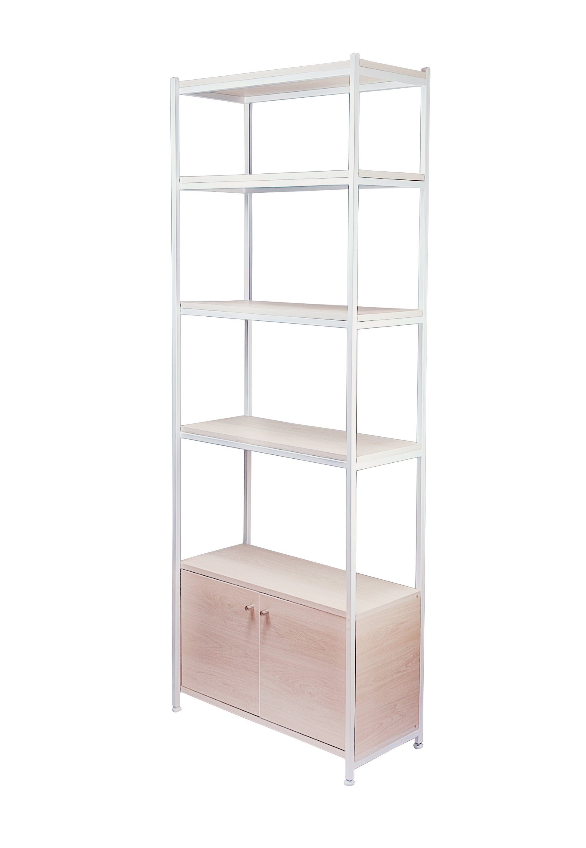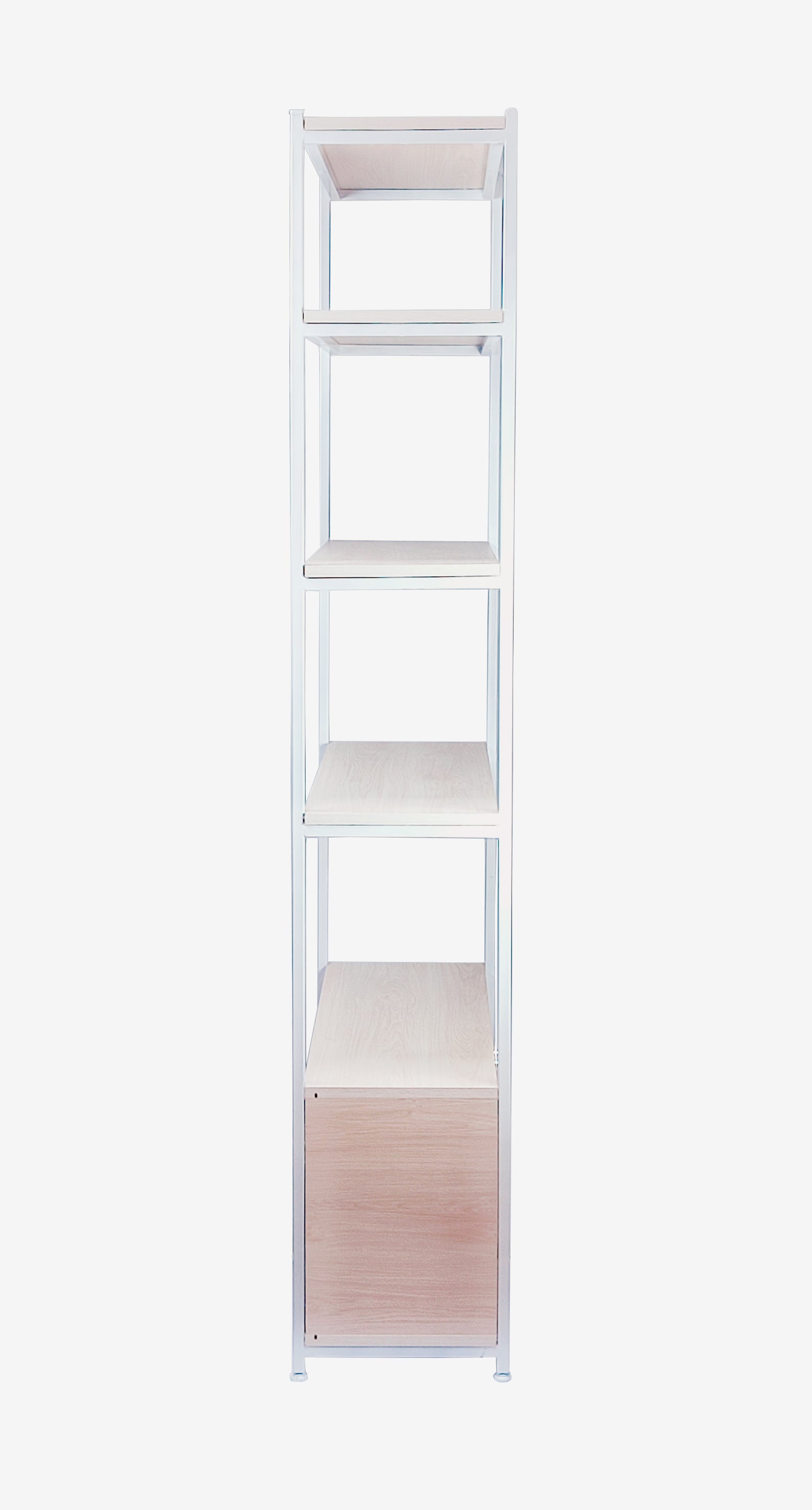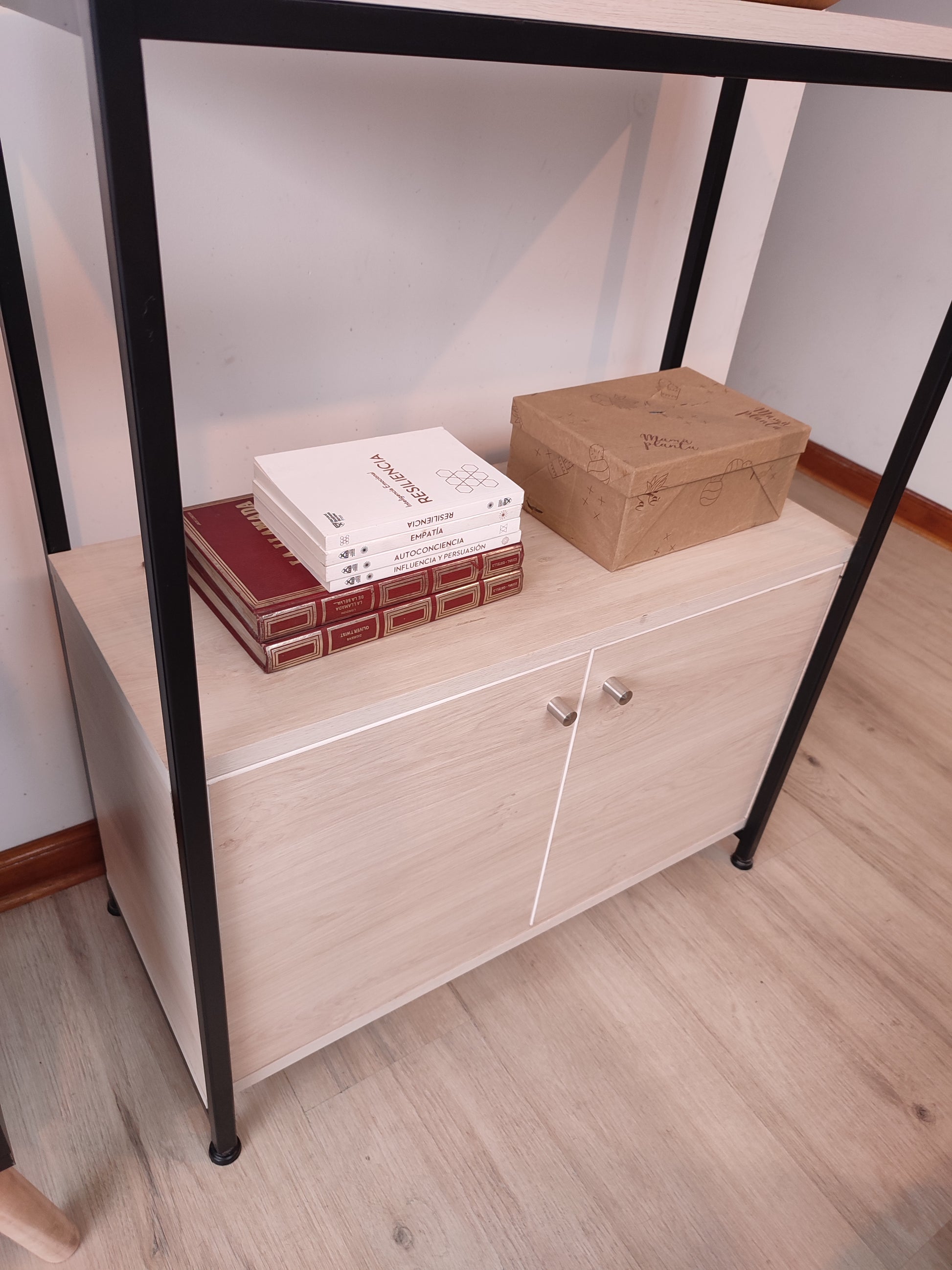 Estante tipo industrial de estructura base de acero y repisas de melamina de 5 niveles. Cuenta con una cajonera con puertas abatibles en la zona inferior.