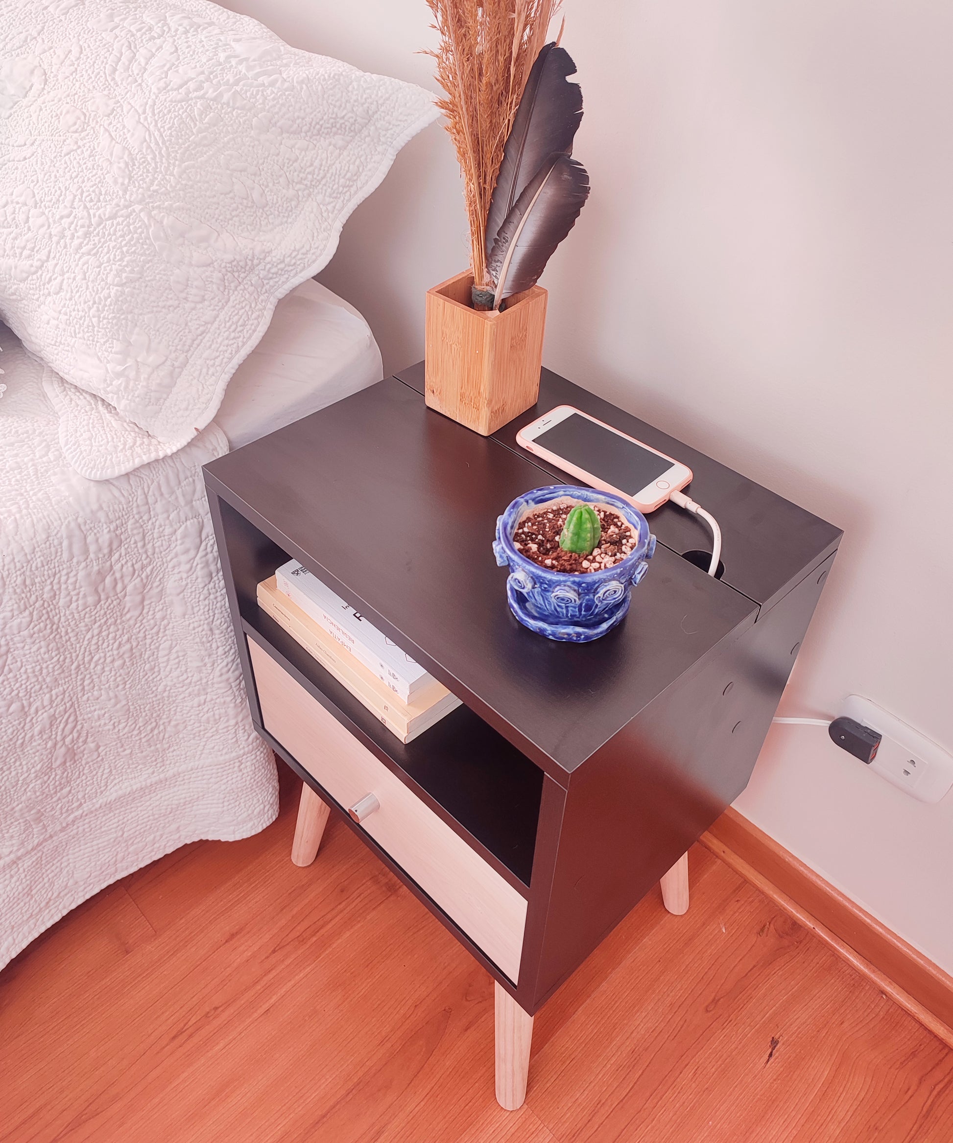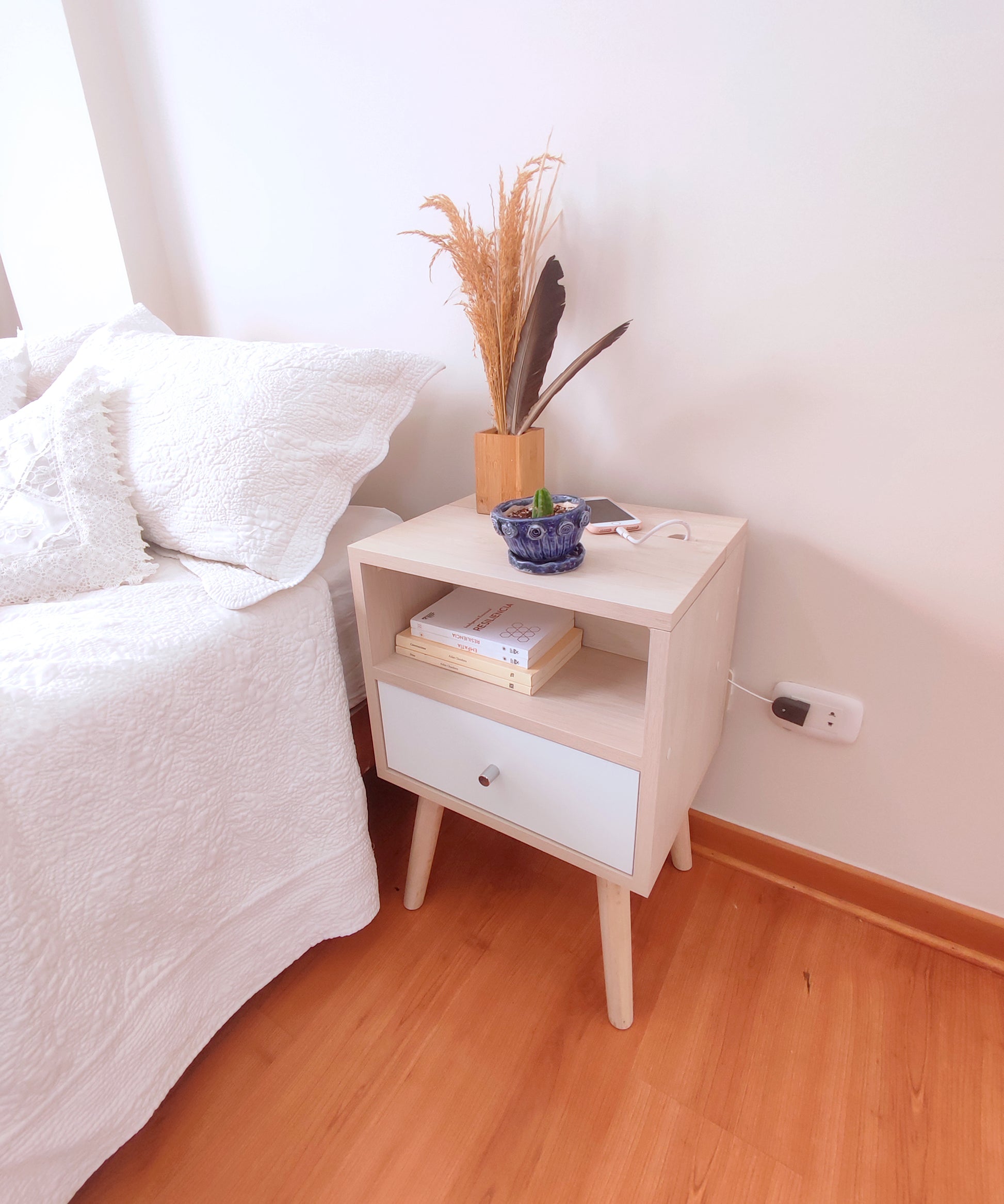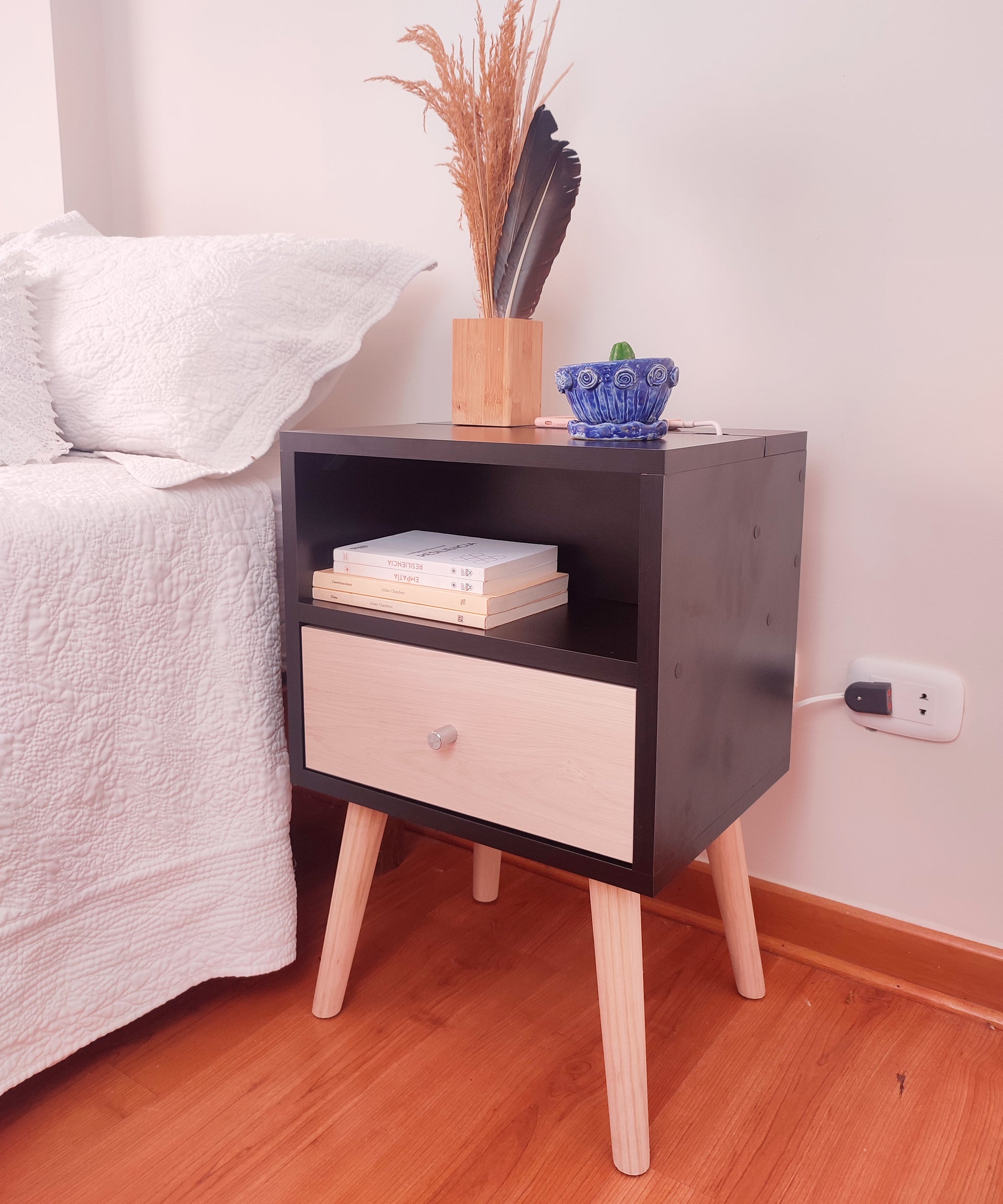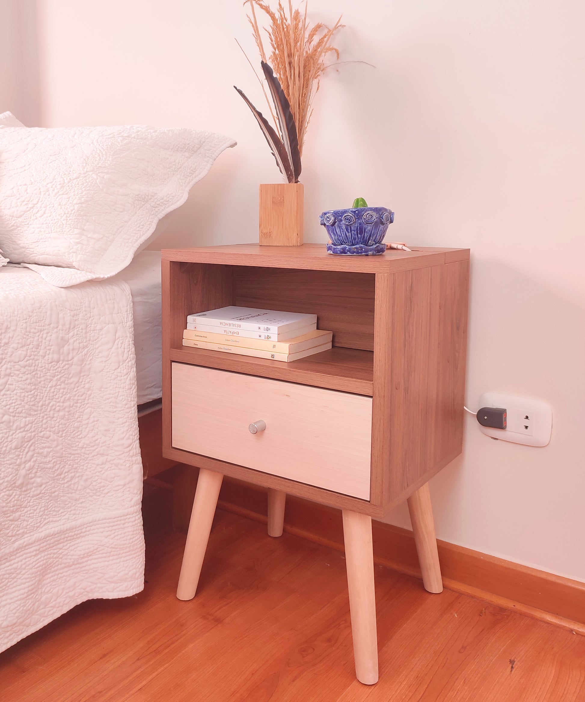 Nuestra mesa de noche Abedul, con su diseño elegante, acogedor y funcional, viene con un tomacorriente incorporado y un enchufe reversible como solución perfecta a la obstrucción o lejanía de los tomacorrientes al lado de tu cama, poniendo uno a tu alcance de forma práctica y estética. Ademas de su funcionalidad, su estilo vintage añadirá un toque de encanto a tu dormitorio.
