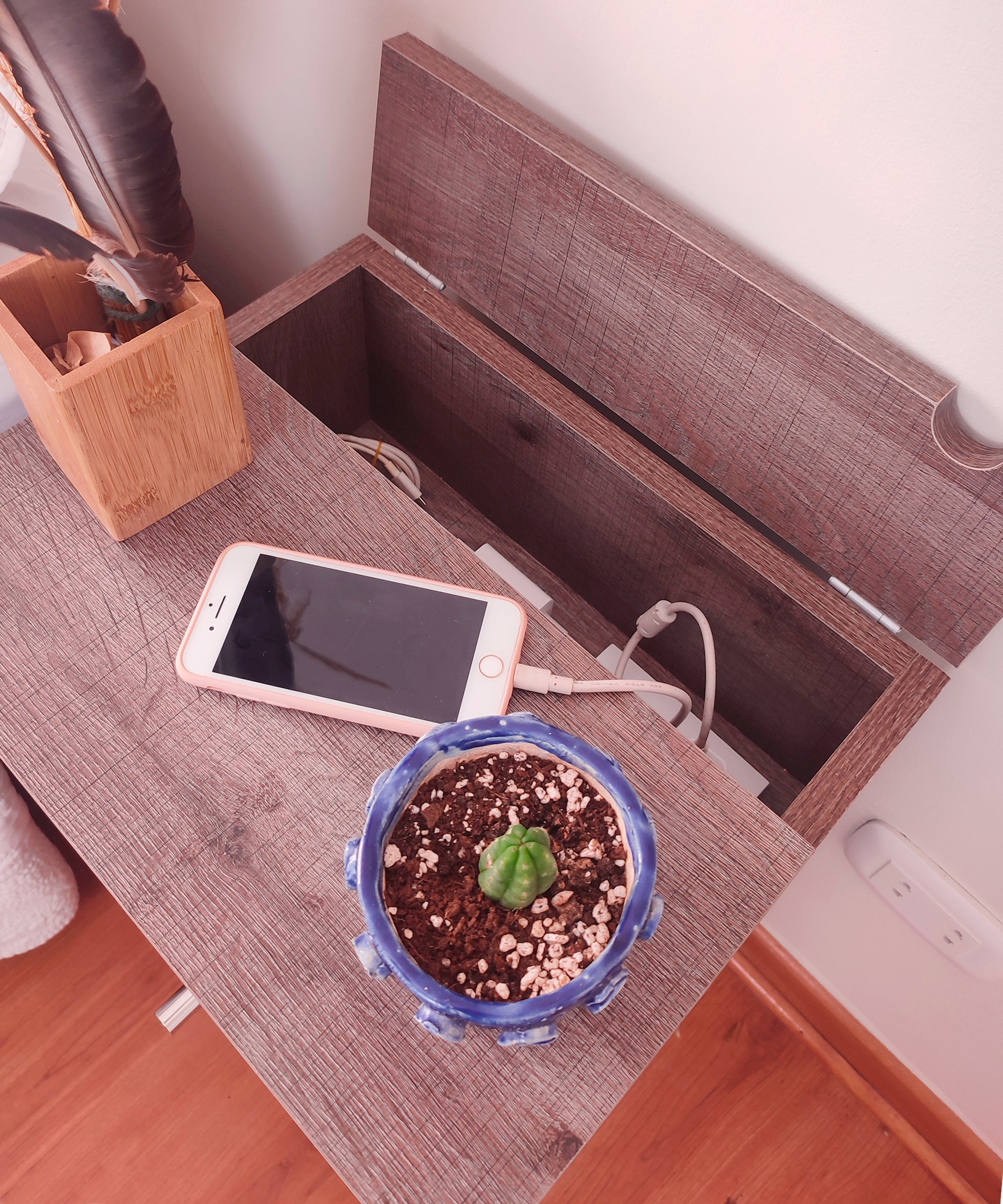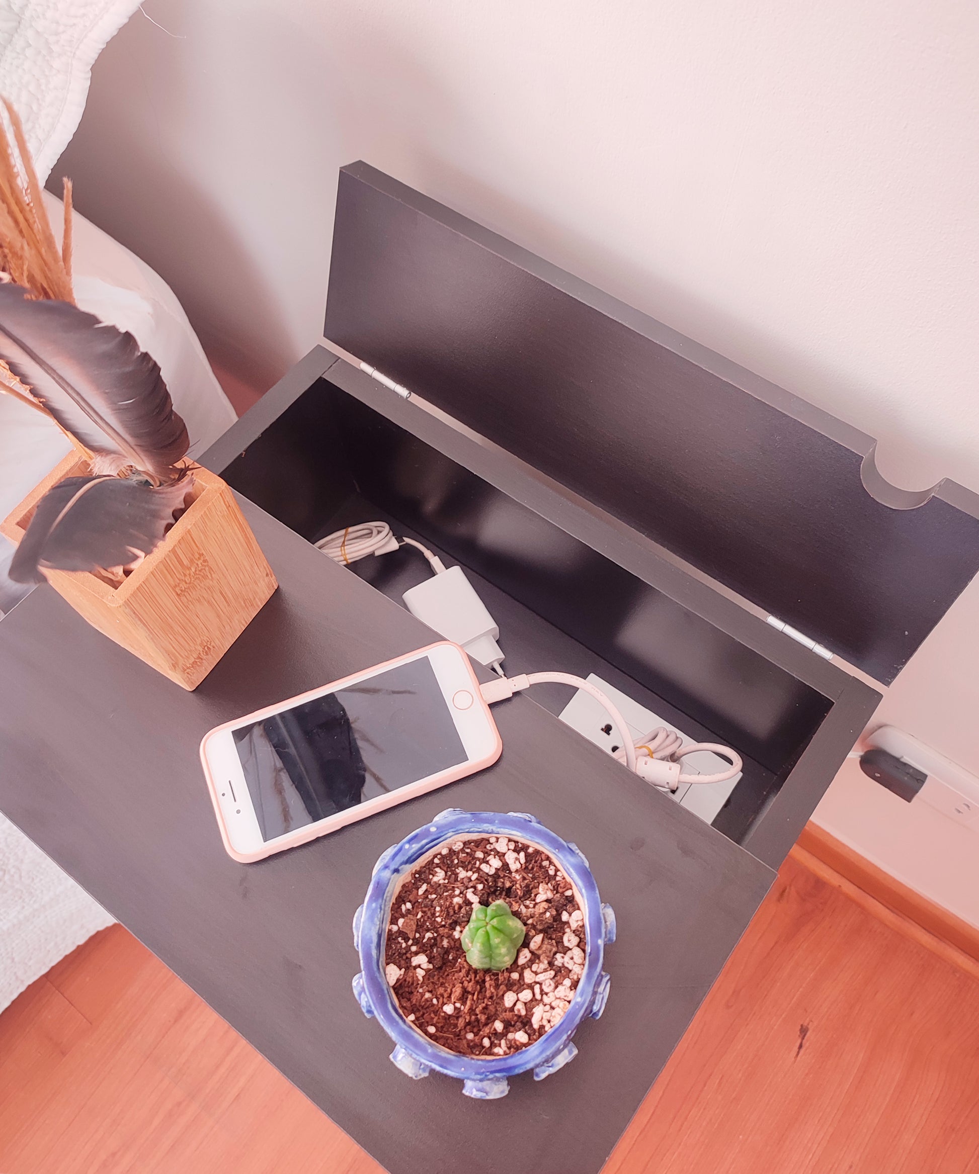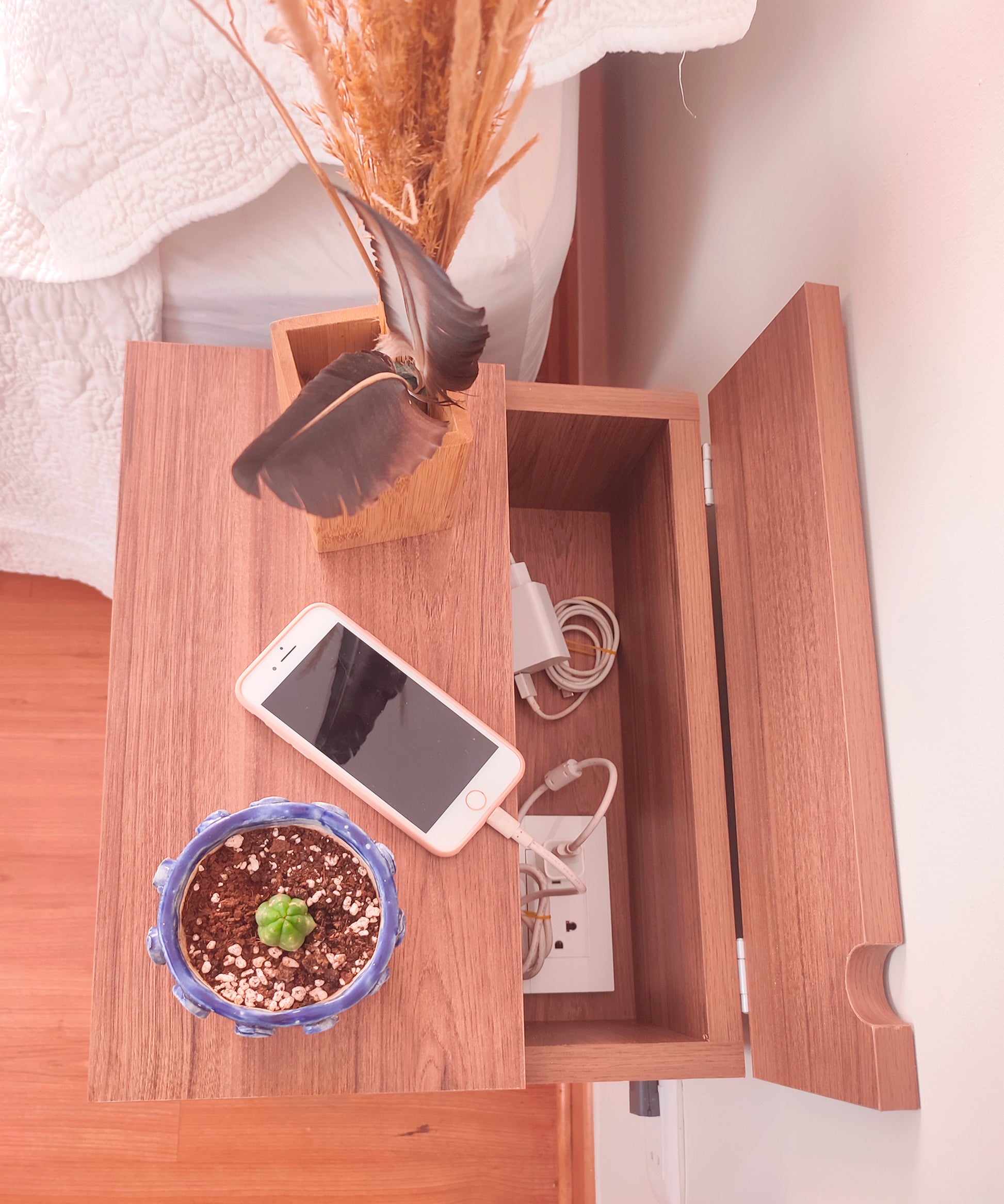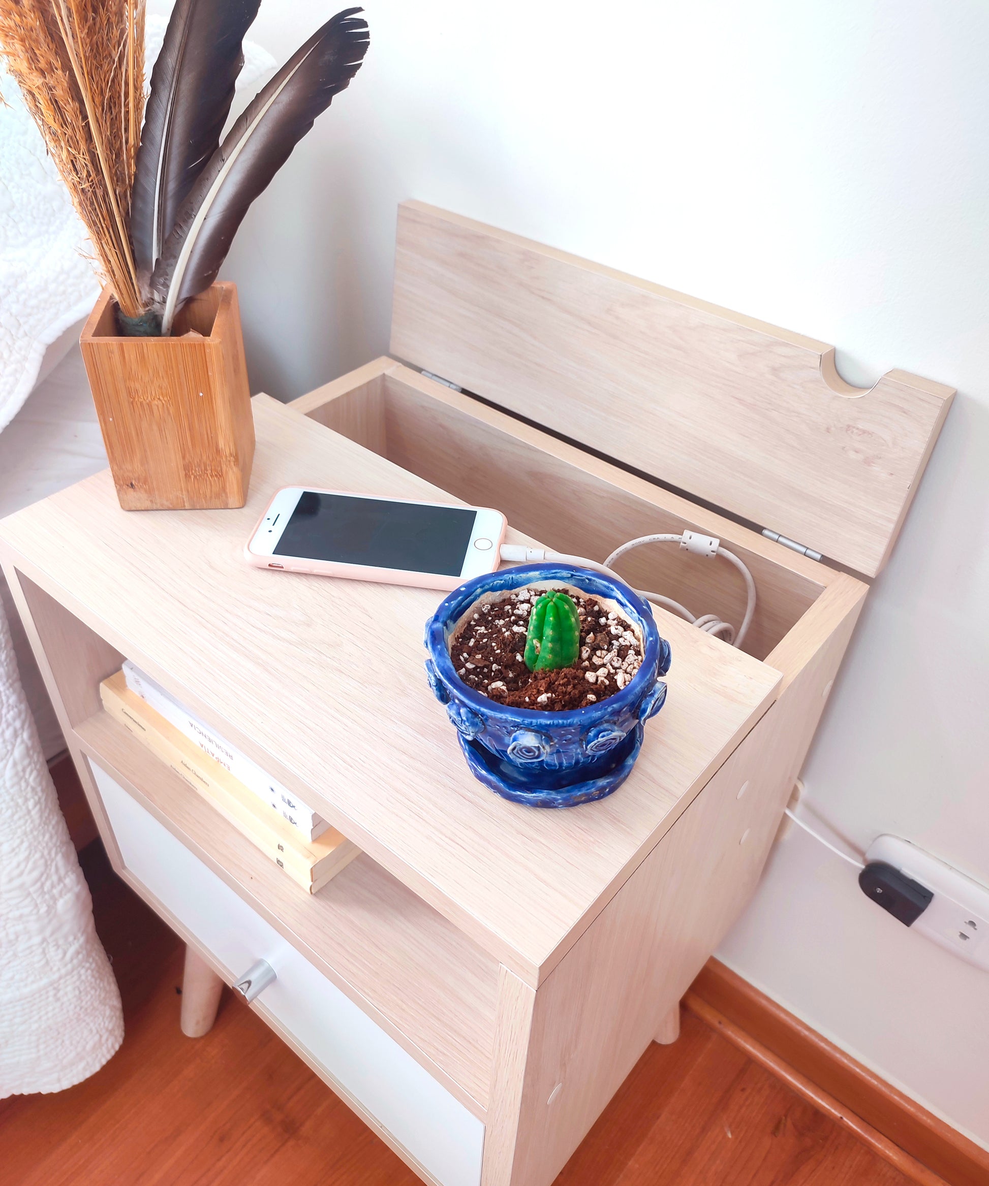 Nuestra mesa de noche Abedul, con su diseño elegante, acogedor y funcional, viene con un tomacorriente incorporado y un enchufe reversible como solución perfecta a la obstrucción o lejanía de los tomacorrientes al lado de tu cama, poniendo uno a tu alcance de forma práctica y estética. Ademas de su funcionalidad, su estilo vintage añadirá un toque de encanto a tu dormitorio.