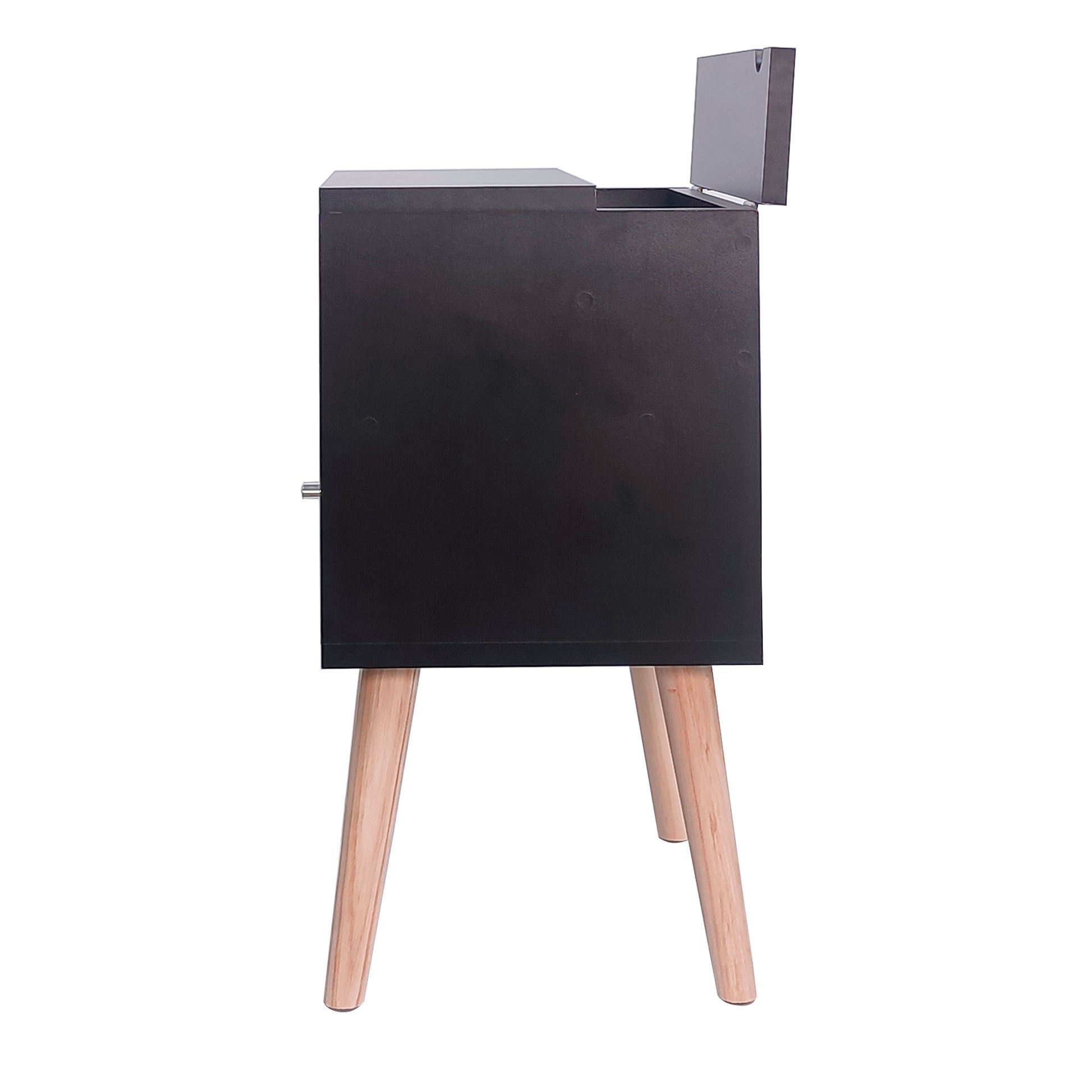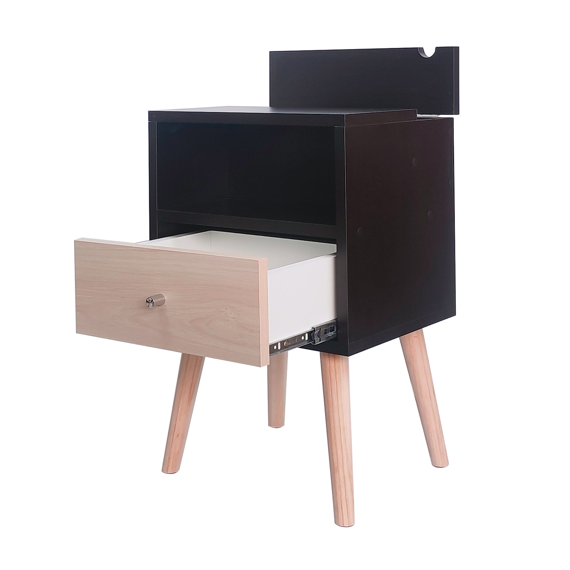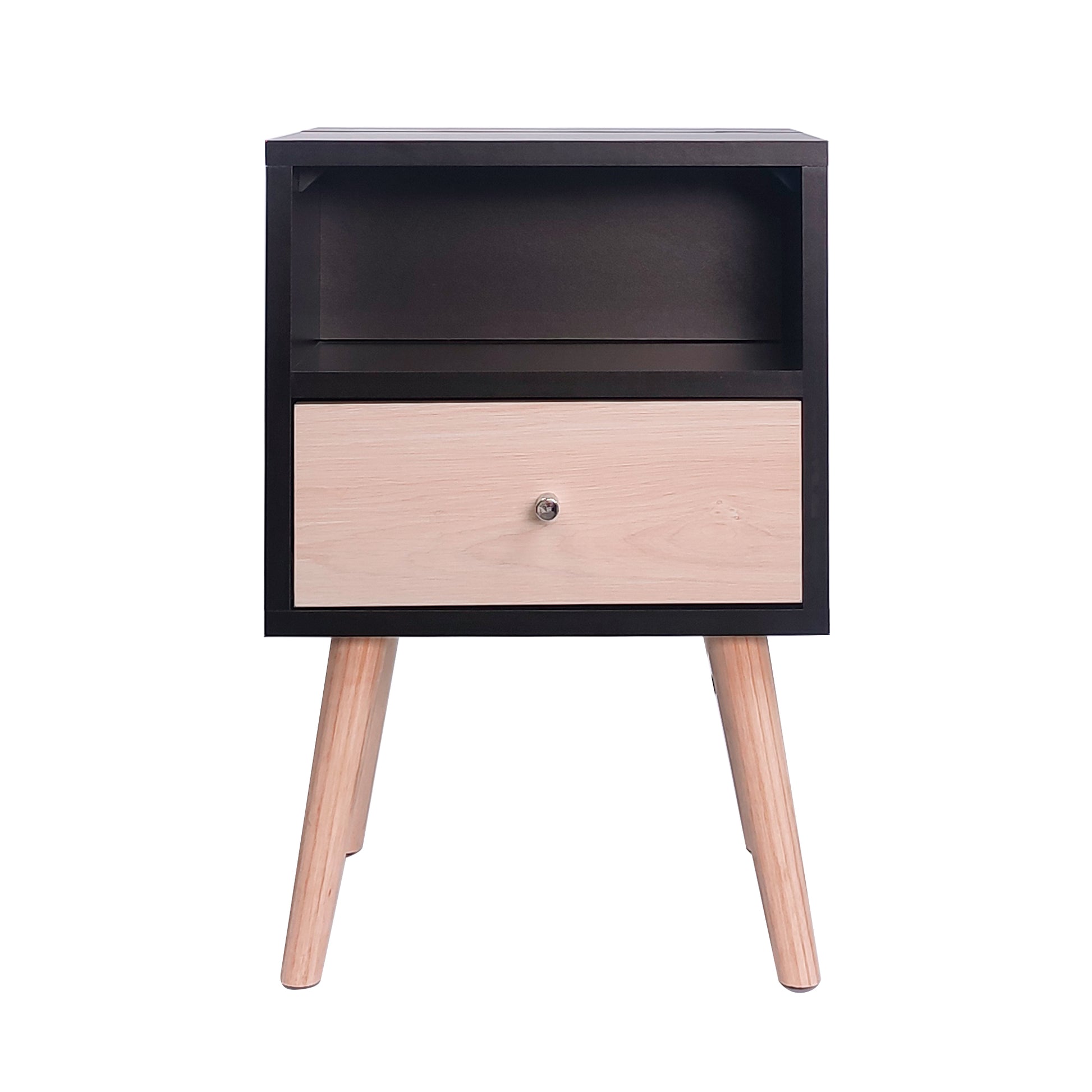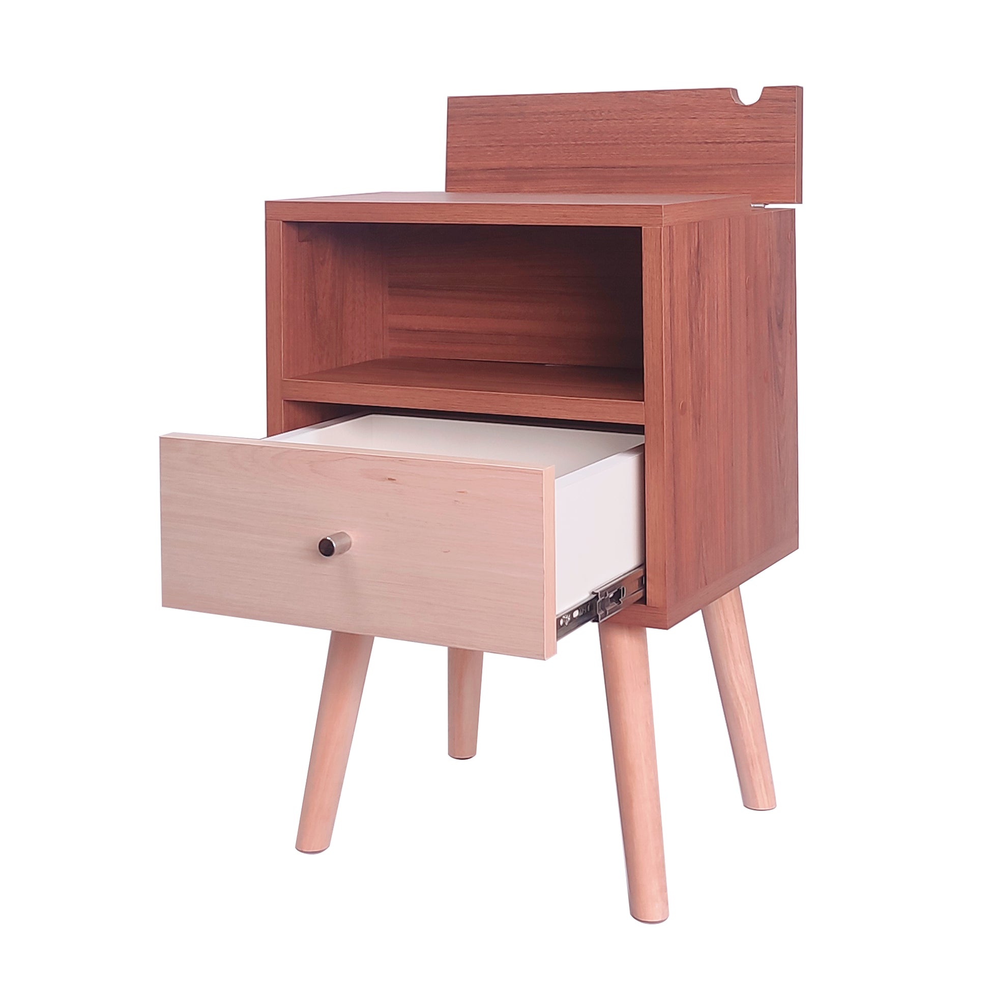 Mesa de noche estilo vintage, con una cajonera, un compartimiento abierto y un compartimiento con tomacorriente para poder guardar dispositivos o cargadores. Viene con una enchufe reversible y cable de 50 cm.