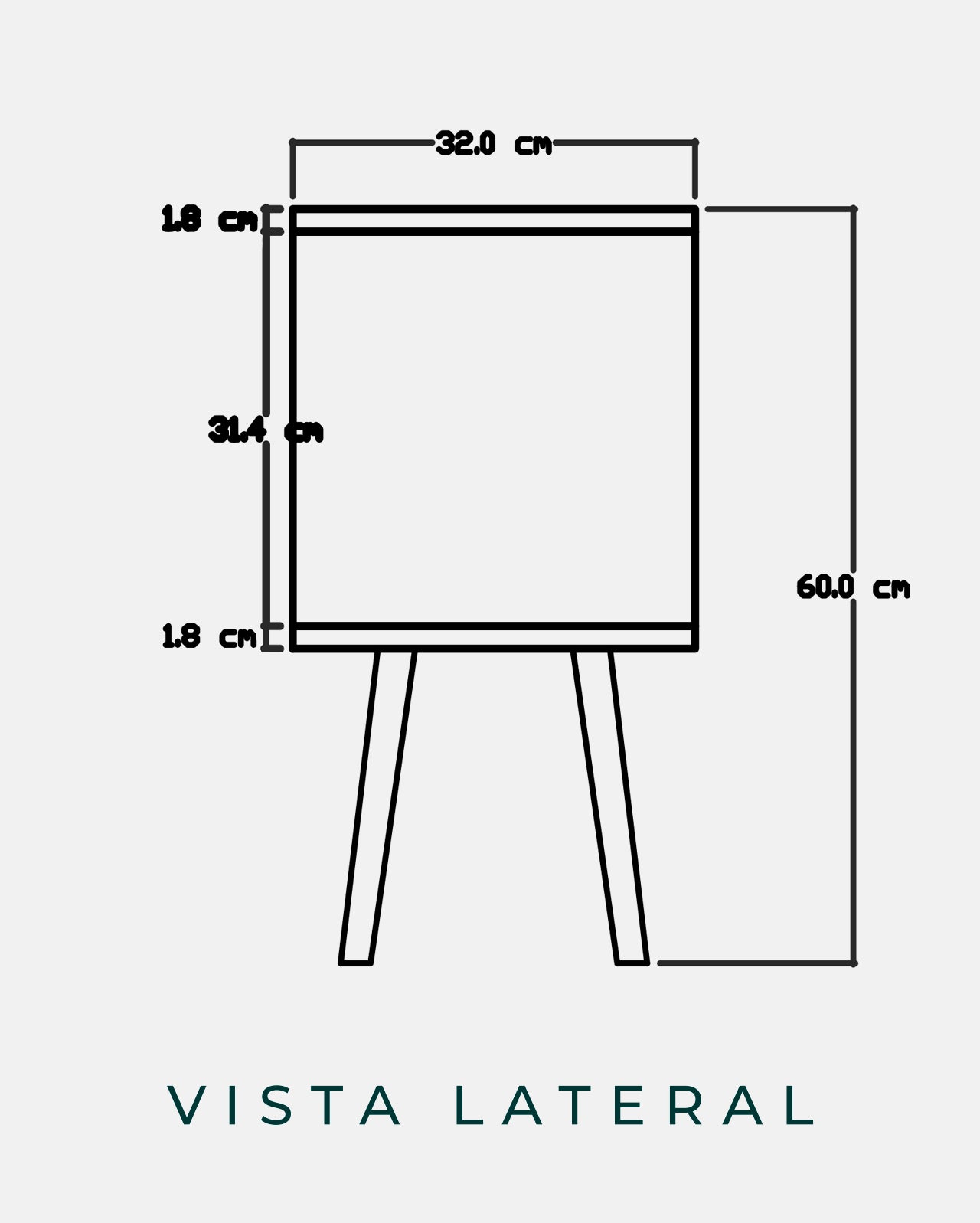 Ancho: 40 cm | Profundidad: 32 cm | Altura cuerpo de velador: 35 cm | Altura de patas: 25 cm | Altura total: 60 cm