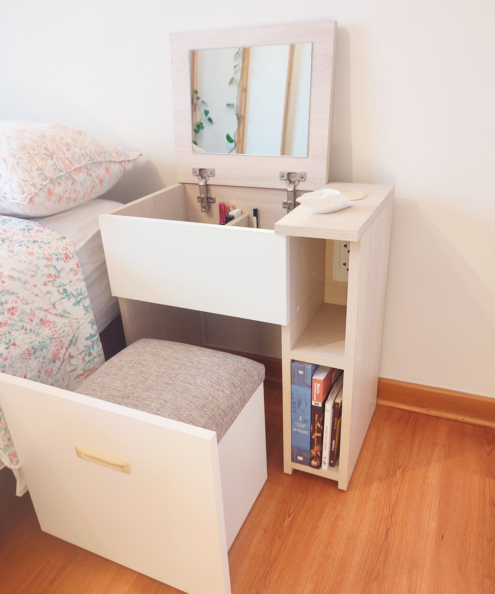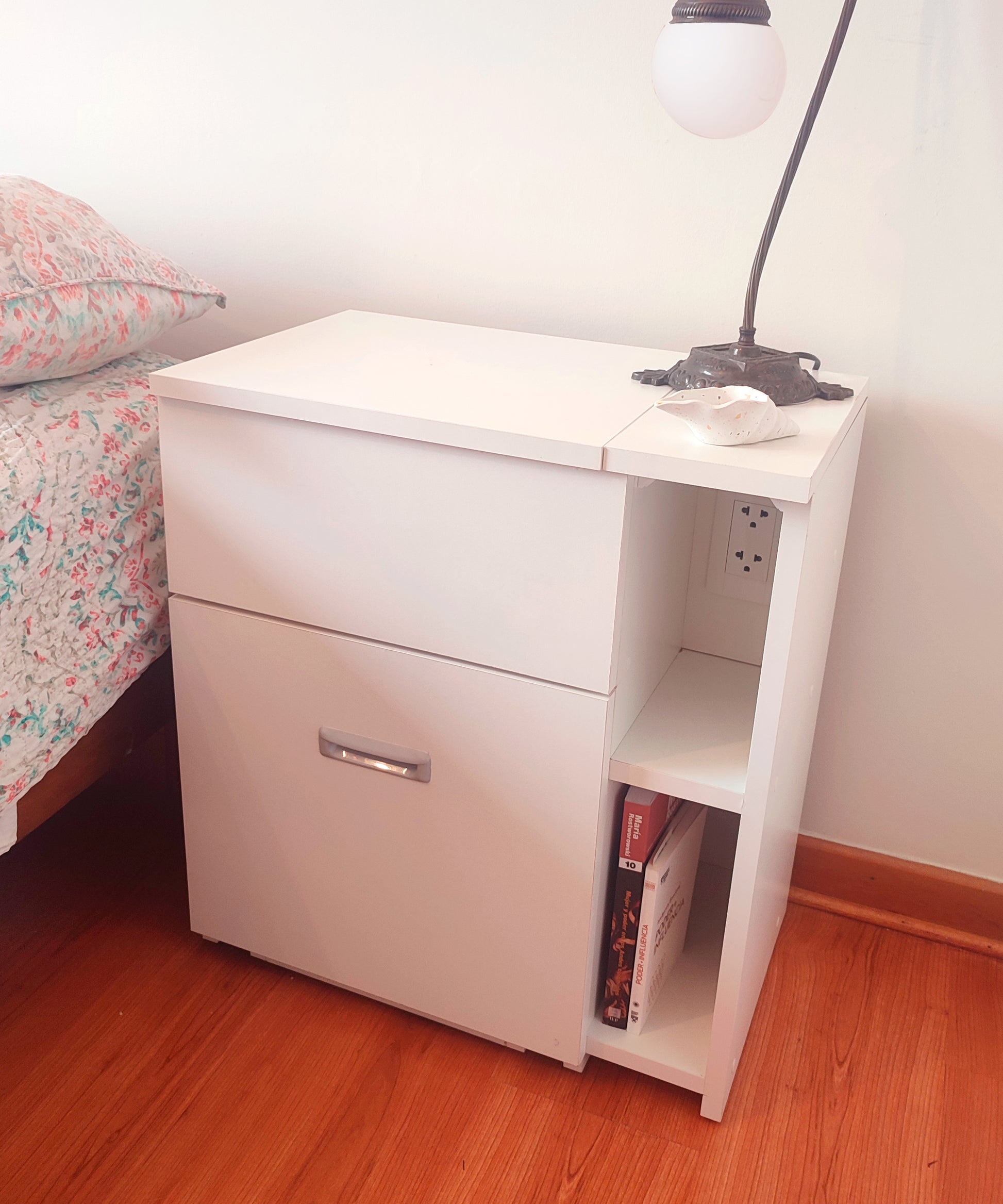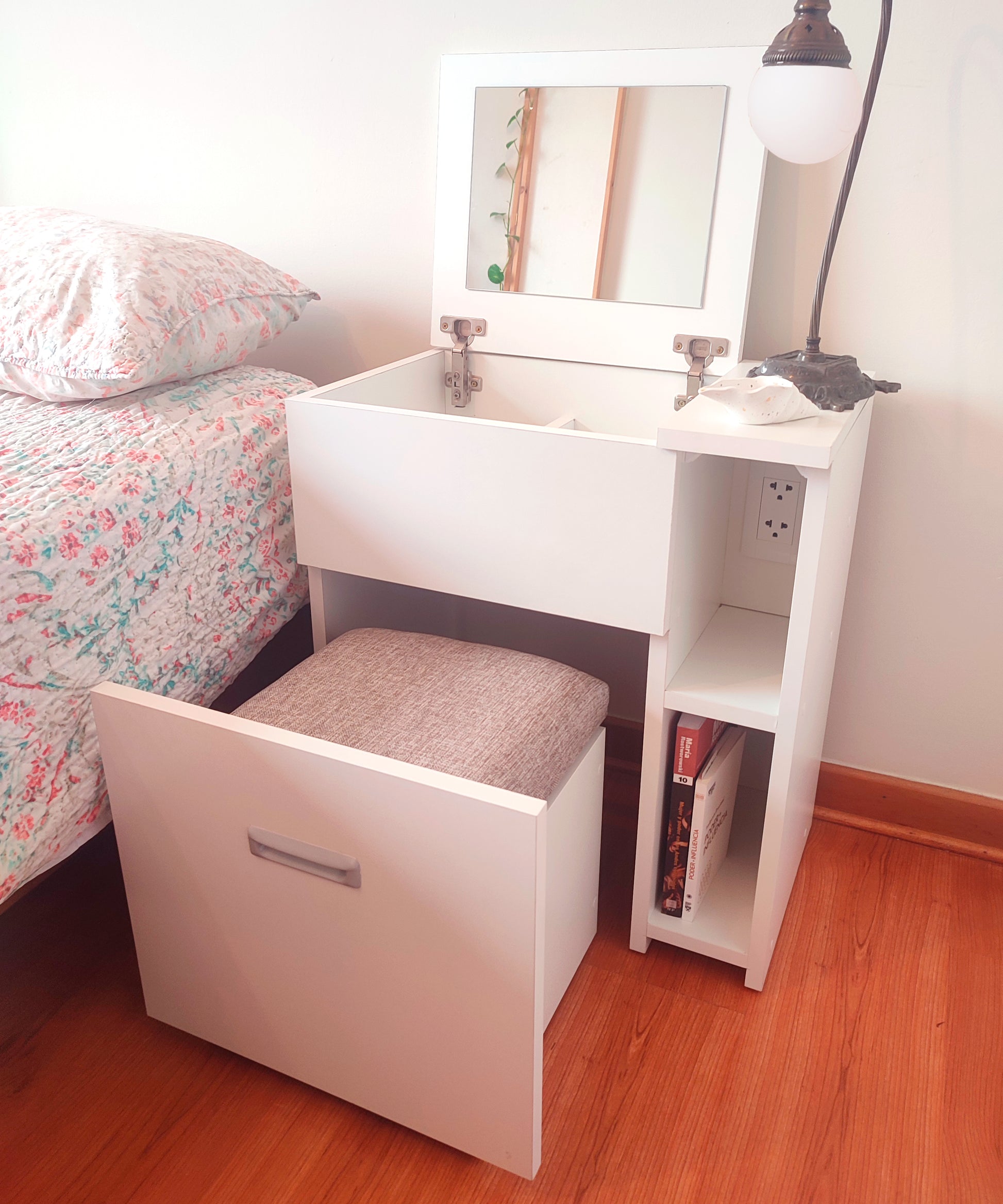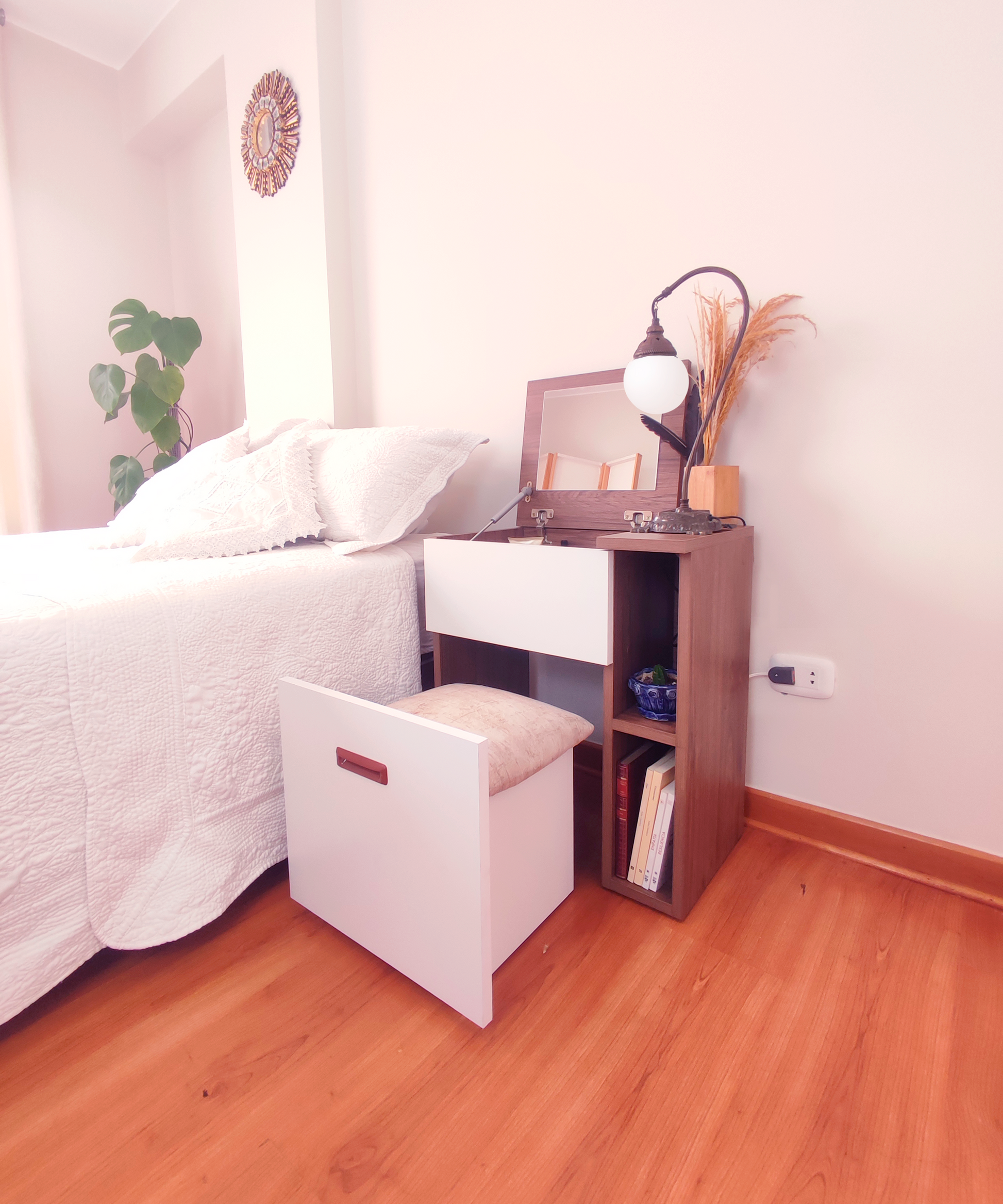 Mesa de noche convertible a tocador con tablero giratorio con espejo de 30x30cm y bisagras de cierre lento. Cuenta con un compartimiento con separadores para artículos de belleza o cuidado personal, una banca independiente con baúl interior, un espacio fijo para una lampara u otro artefacto, un compartimiento con tomacorriente y pasacables. Viene con una enchufe reversible y cable de 50 cm.