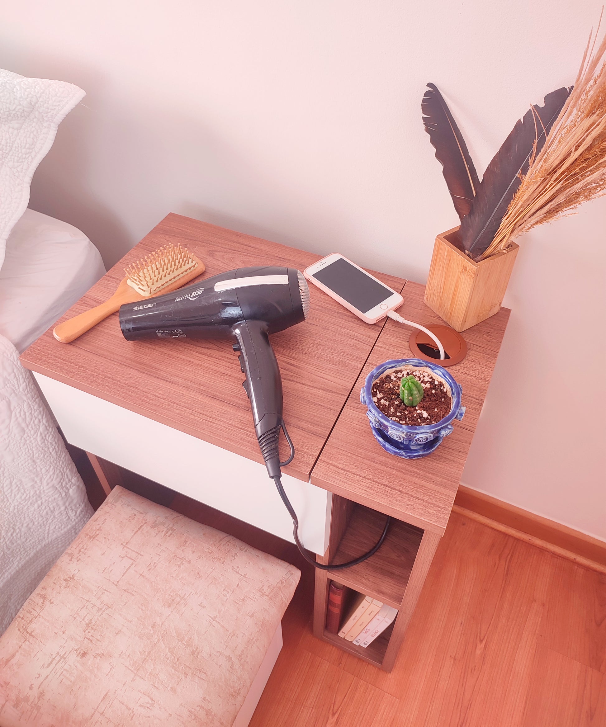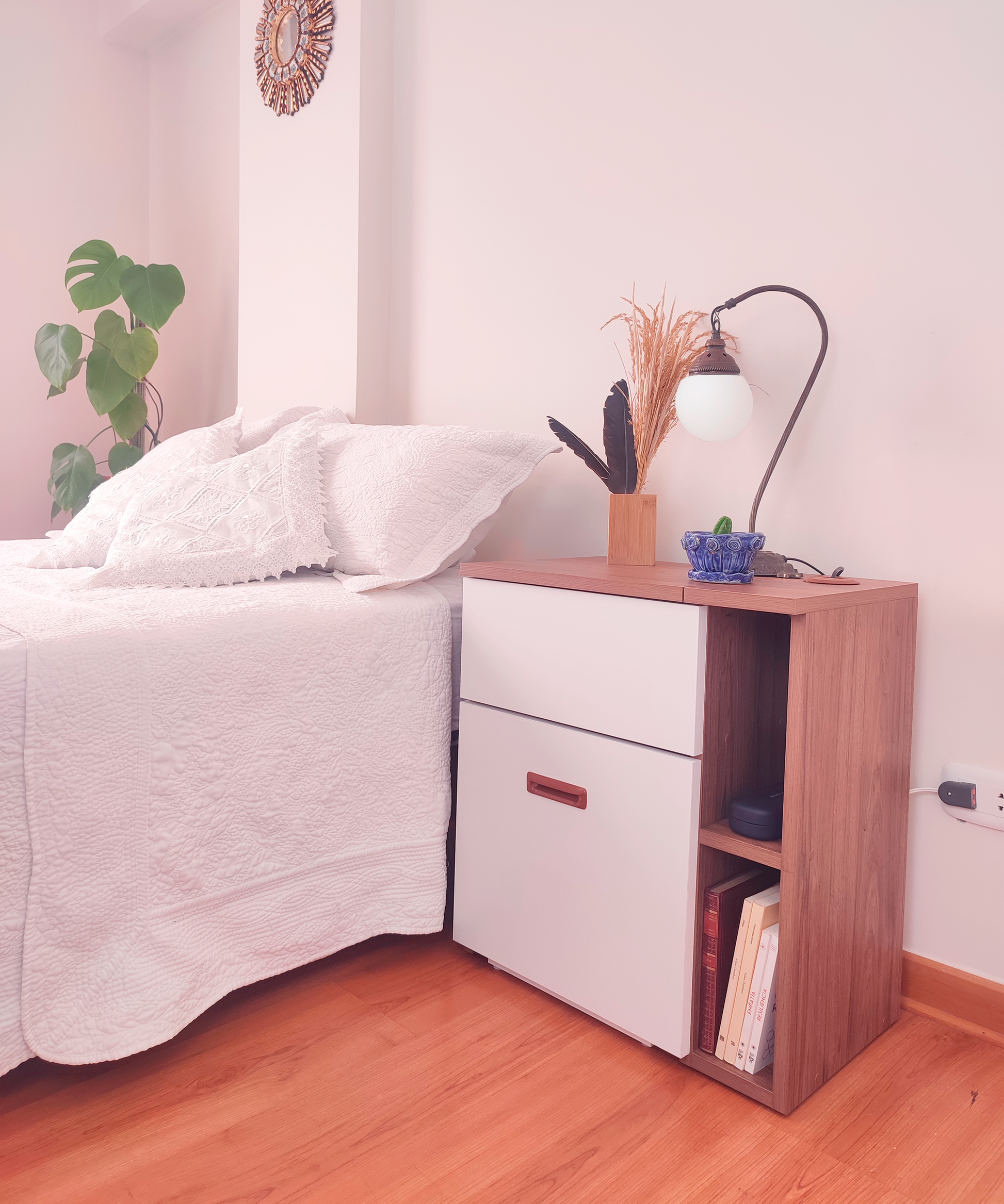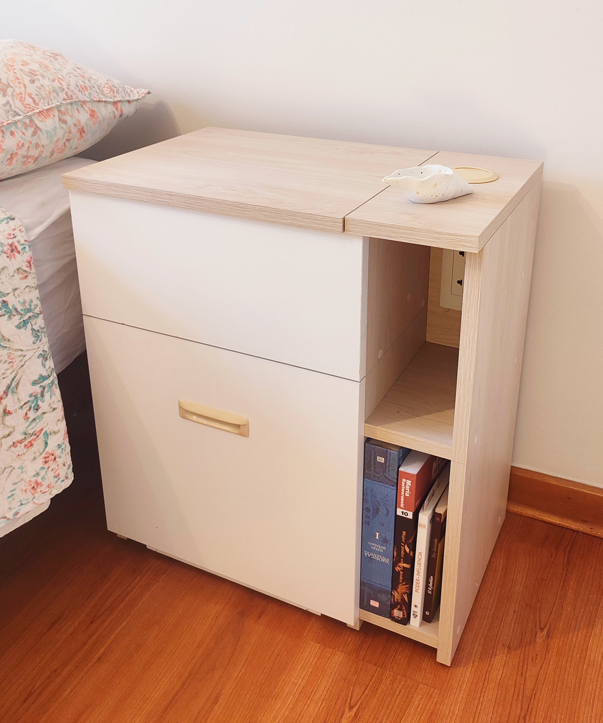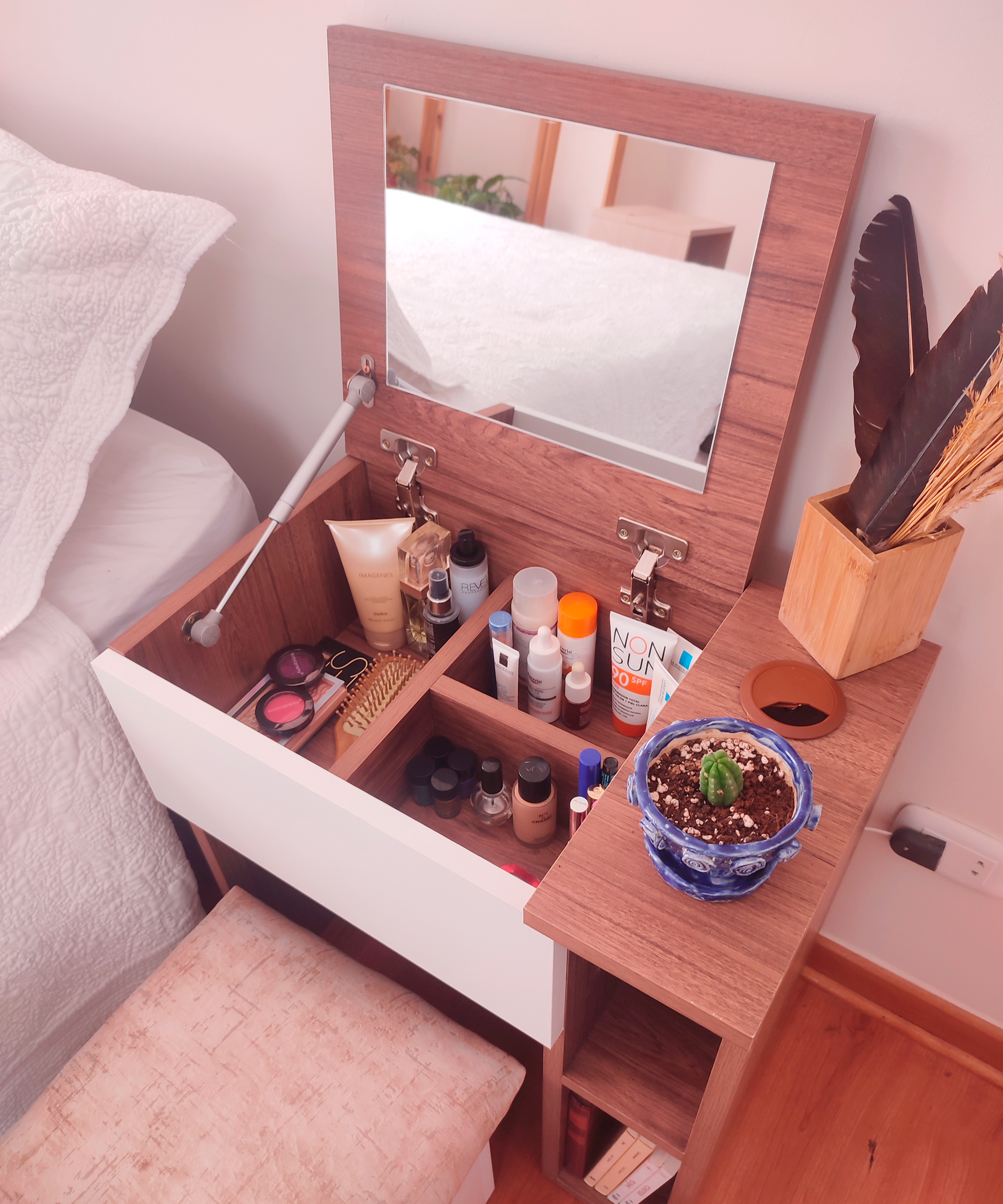 Mesa de noche convertible a tocador con tablero giratorio con espejo de 30x30cm y bisagras de cierre lento. Cuenta con un compartimiento con separadores para artículos de belleza o cuidado personal, una banca independiente con baúl interior, un espacio fijo para una lampara u otro artefacto, un compartimiento con tomacorriente y pasacables. Viene con una enchufe reversible y cable de 50 cm.