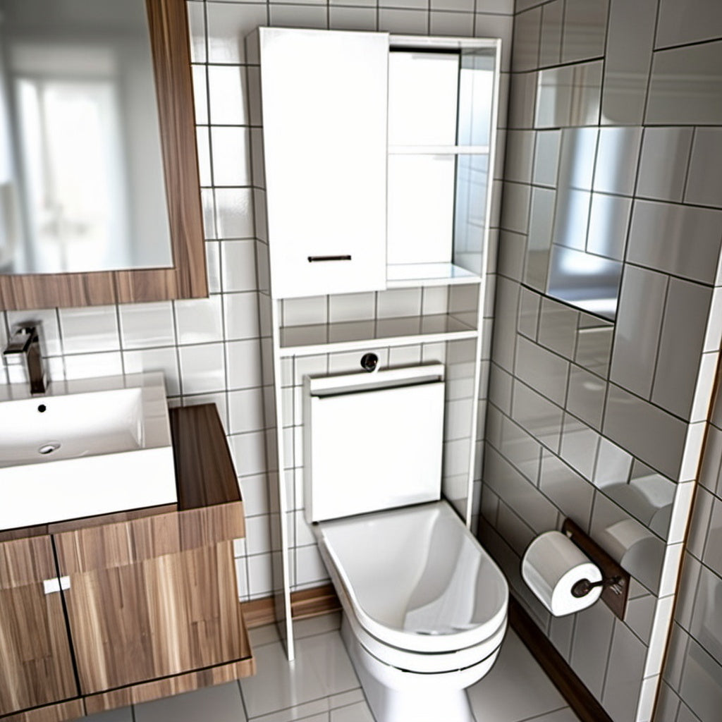 Estante para baño diseñado para ubicarse sobre inodoro con 3 niveles de repisas y una puerta abatible, confeccionado en base a Melamina RH (resistente a la humedad) de 18mm en color blanco.